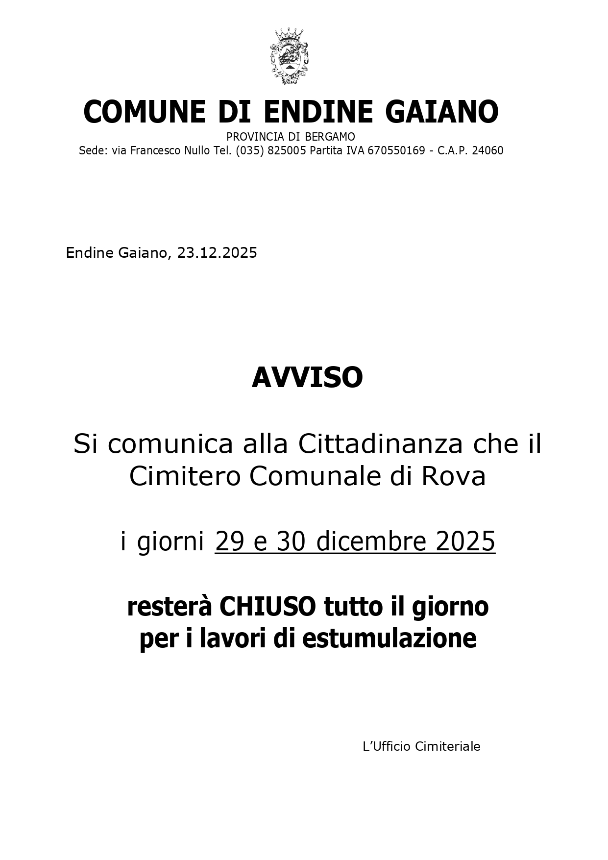 Si comunica alla Cittadinanza che il Cimitero Comunale di Rova i giorni 29 e 30 dicembre 2025 resterà CHIUSO tutto il giorno per i lavori di estumulazione